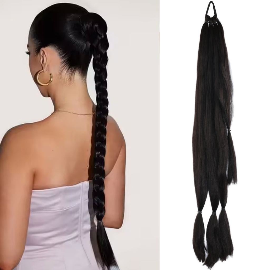 Üçlü Örgü Tokalı At Kuyruğu - Koyu Kestane
